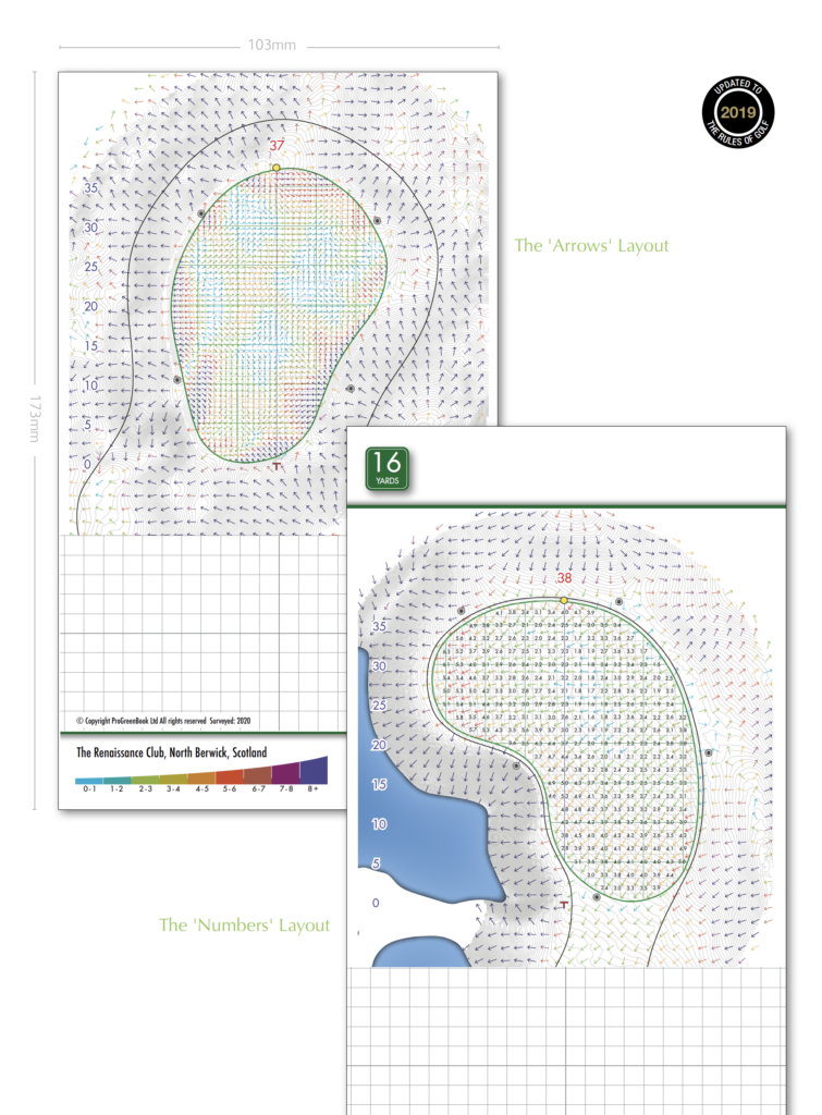 The book is made using laser and GPS survey data which enables us to model the green surface to 1/2 millimetre accuracy. We then use our specialist Clere software which turns the GPS survey data and 3D model into drawings designed to help golfers understand the green and surrounding area.